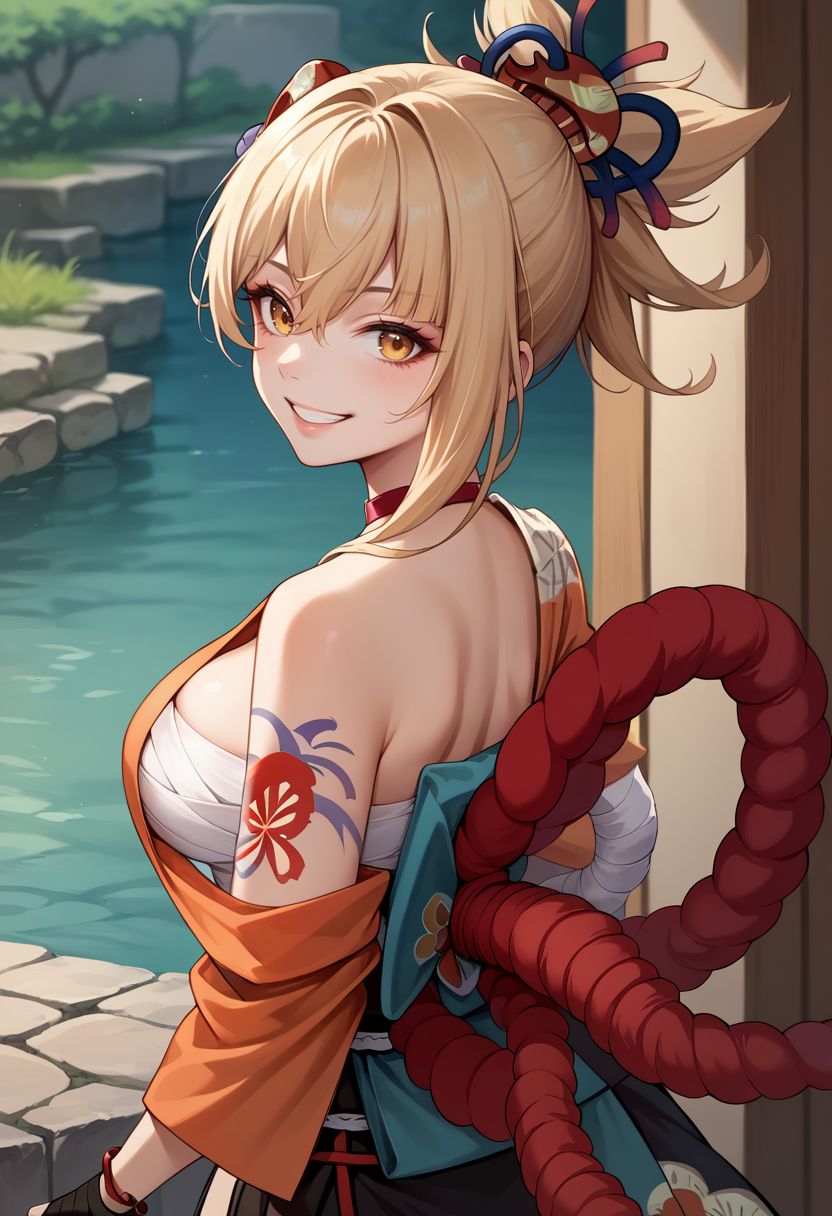 외모: yoimiyadef, 노란 눈, 금발, 플랫테일, 머리 장식, 빨간 목걸이, 중간 크기 가슴, 팔 문신, 꽃 문신, 가슴 문신