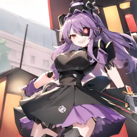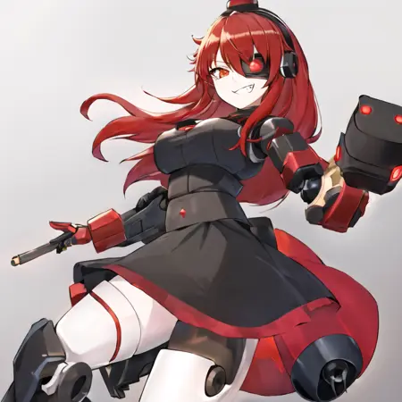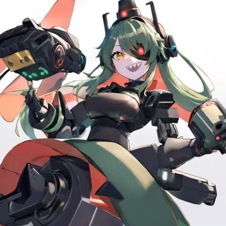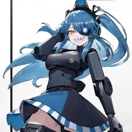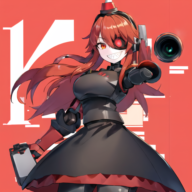 Appearance keywords: artificial eye, eyepatch, siren hat, red hair, sharp teeth, checkered skirt