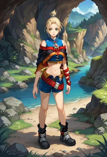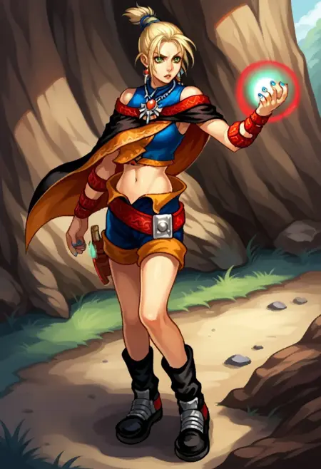 服装:蓝色露脐上衣,无袖露脐上衣,黑色短斗篷,项链,手臂缠绕,不对称手臂,肚脐,蓝色短裤,开衩短裤,黑色踝靴(详见V1标签描述)
