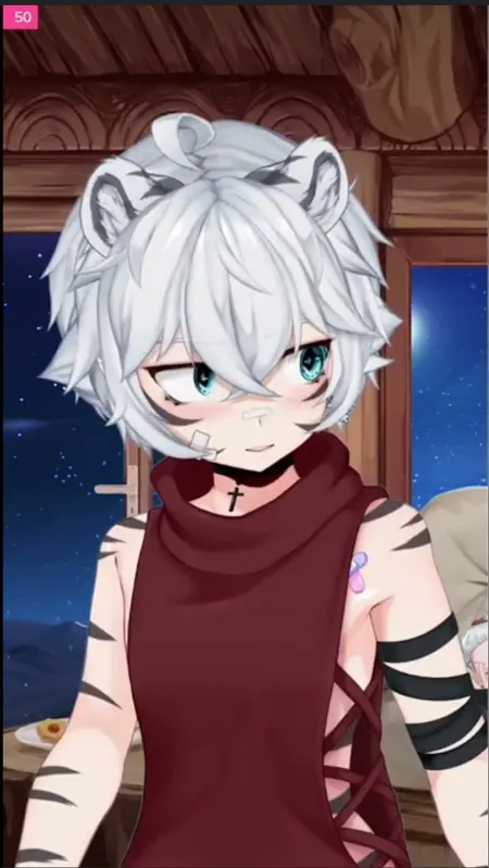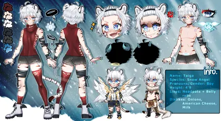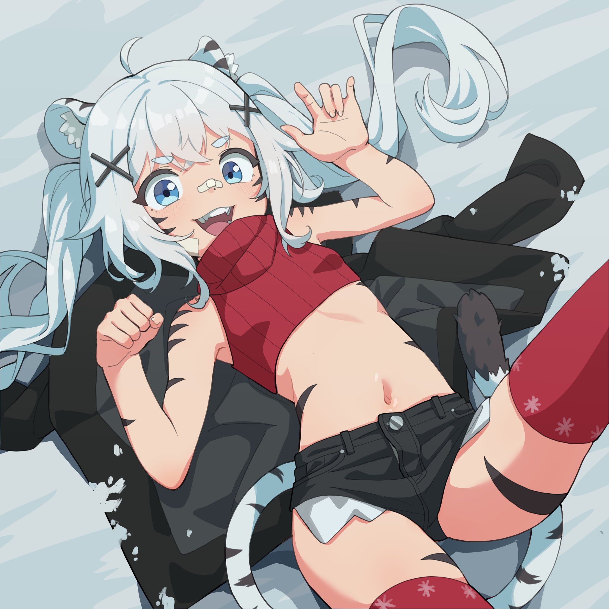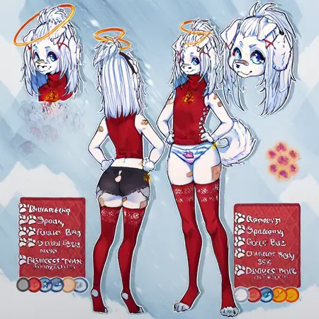 Dog girl, floppy ears, cut off shorts, curled tail, striped panties, medium length hair, ponytail on top, thigh high socks, bandages, red hair clips, crop top, white fur