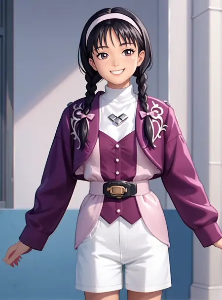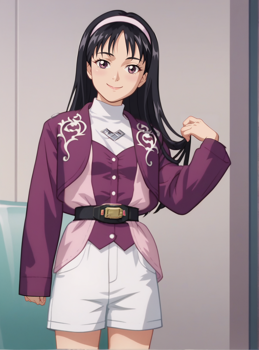 プロンプト: 1girl, black hair, solo, long hair, hairband, shorts, jacket, long sleeves, white shorts