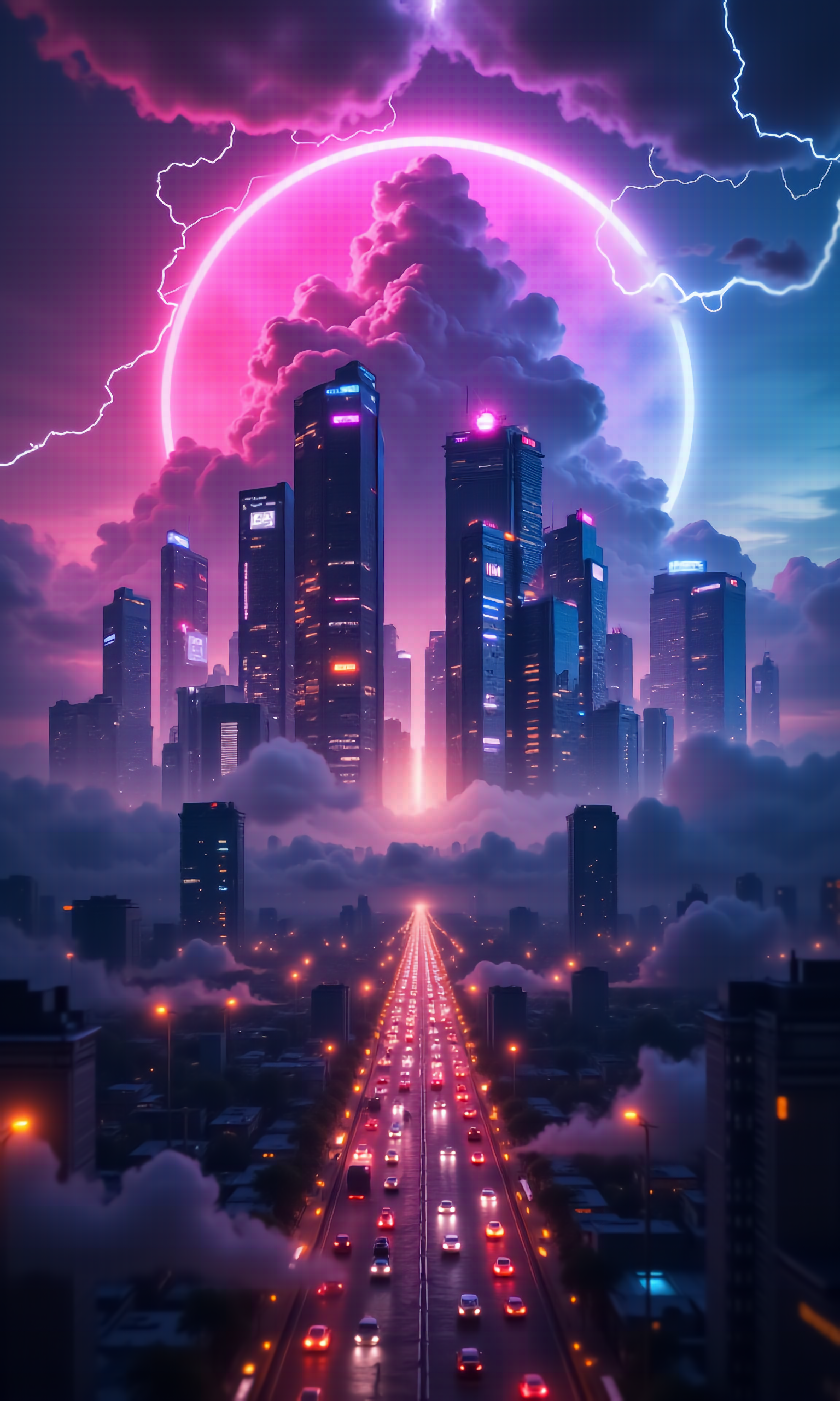 사이버펑크 도시 풍경: 구름 위로 떠오르는 미래 도시 환경을 창조하려는 아티스트 및 디자이너에게 이상적입니다. 고도의 기술과 초현실적, 안개 낀 분위기를 결합합니다.