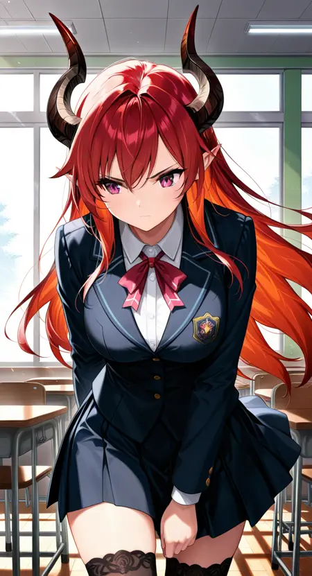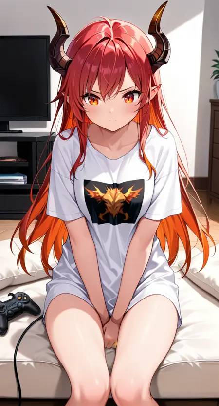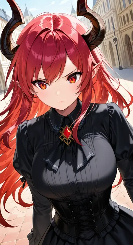 Tags: aizara_oc, dress, red hair, horns, dragon_girl, dragon wings, orange eyes, demonic eyes