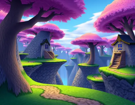 "A Spyyyrouuu style world, the name of this world is: Fairywood Forest, scenery, outdoors, unique color sky, hills, architecture, trees."