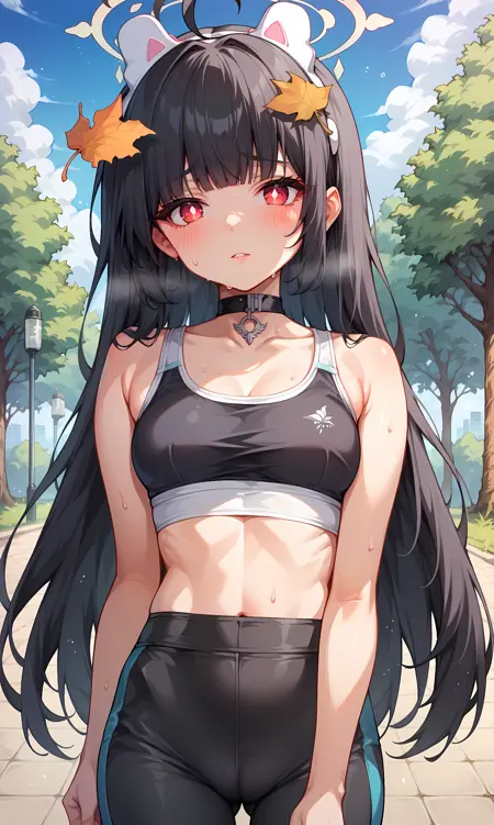 miyu,红眼睛,黑发,长发,齐刘海,呆毛,头上叶子,假动物耳朵,光环,白色瞳孔