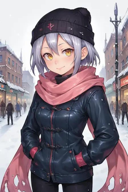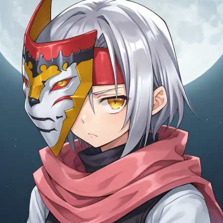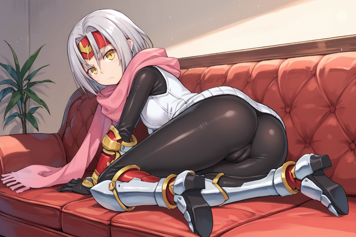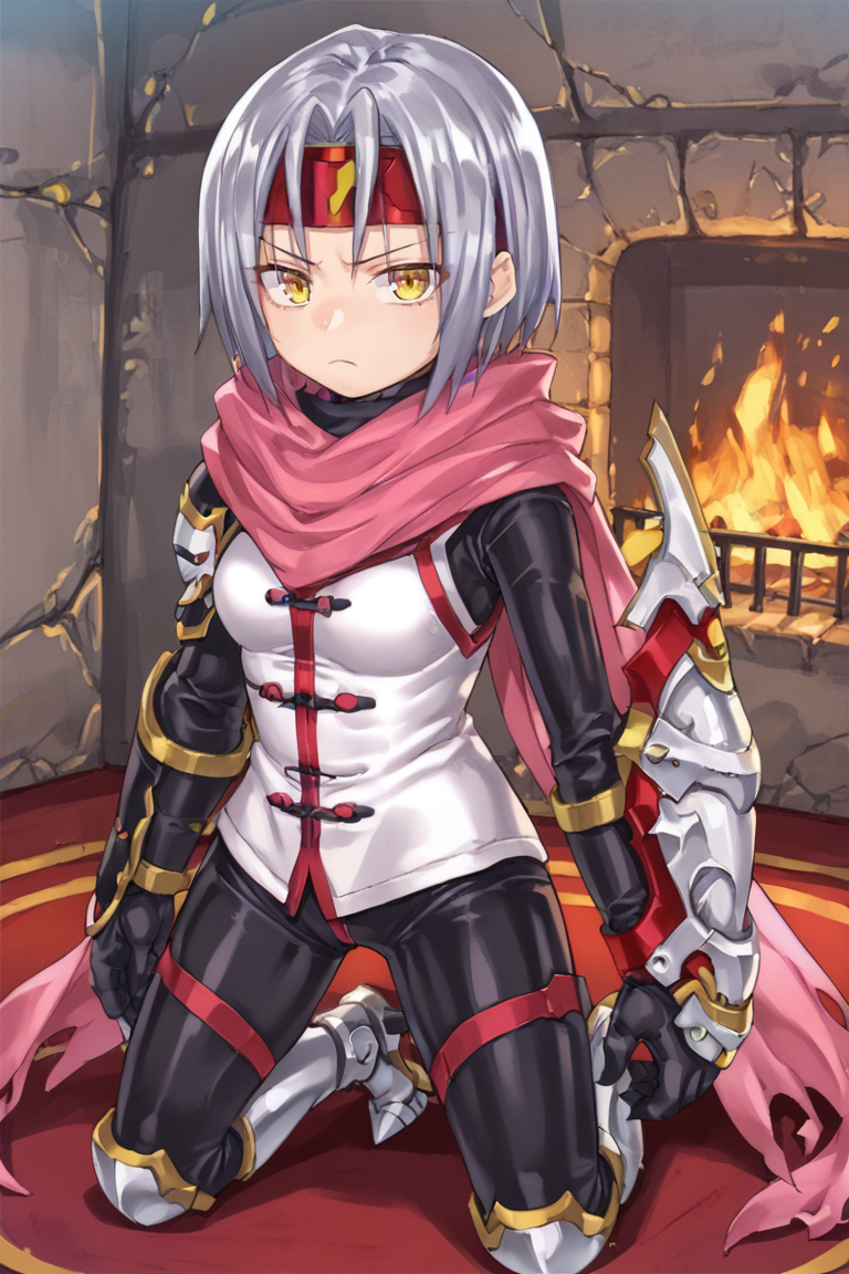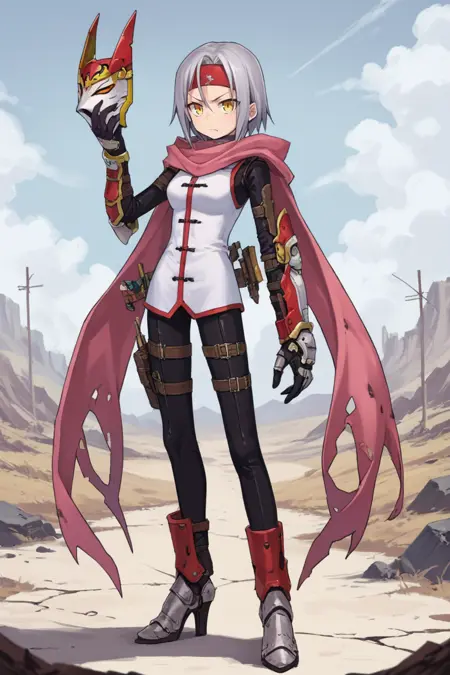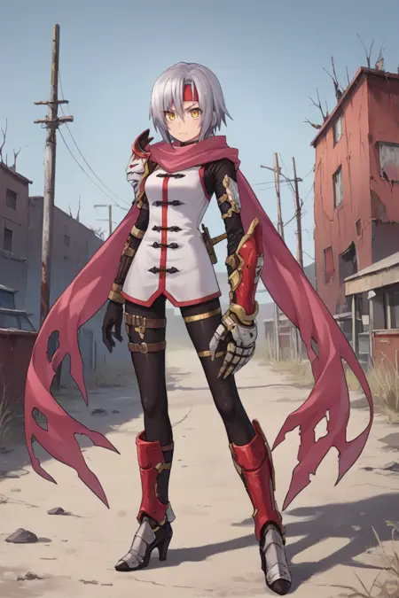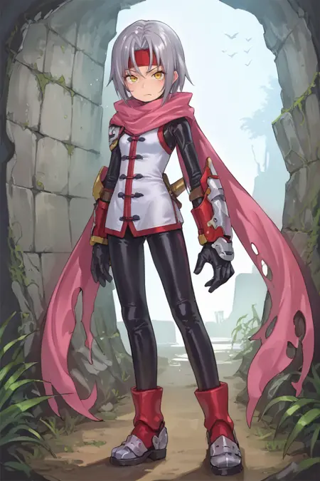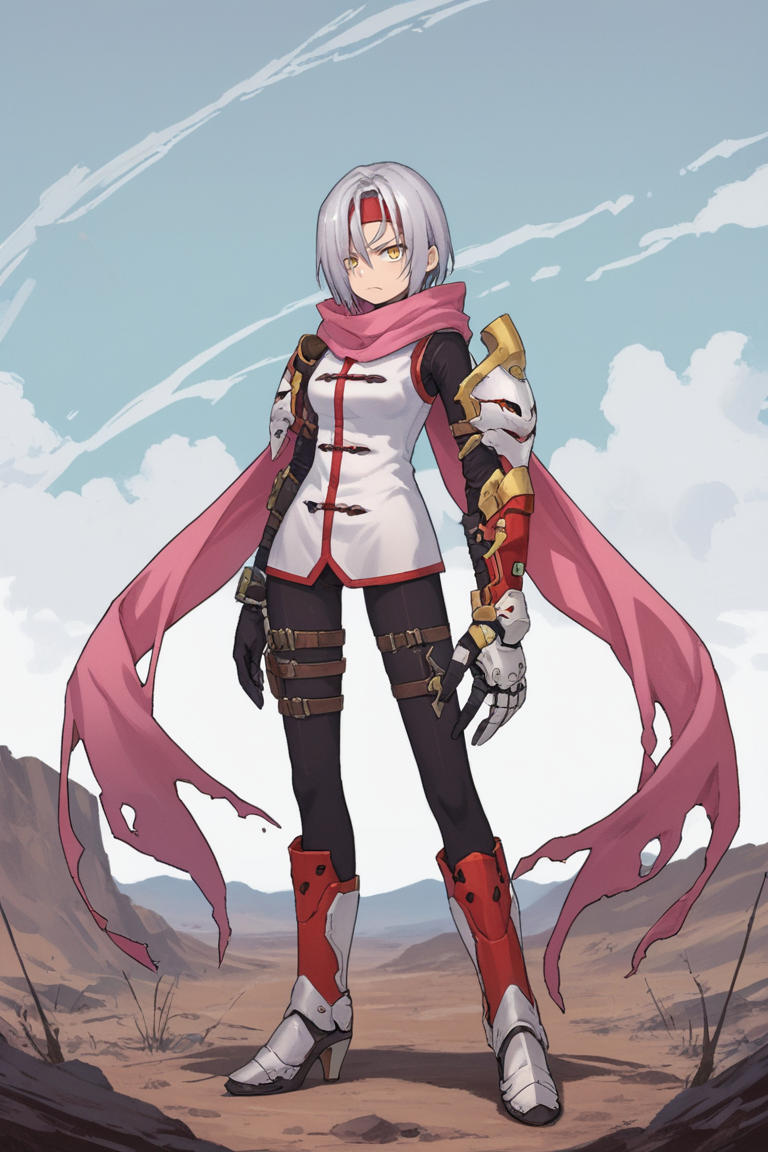 Helpful Tags: 1girl, short hair, grey hair, yellow eyes, red headband, scarf, pink scarf, white vest, white shirt, bodysuit, black bodysuit, bodysuit under clothes, single gauntlet, black gloves, sheathed, armored shoes,