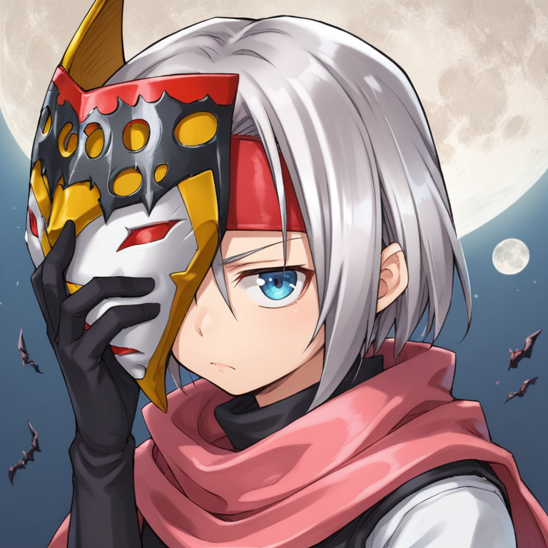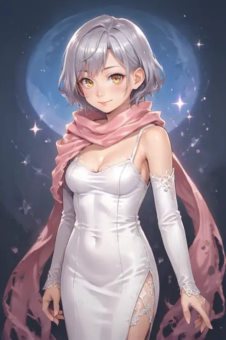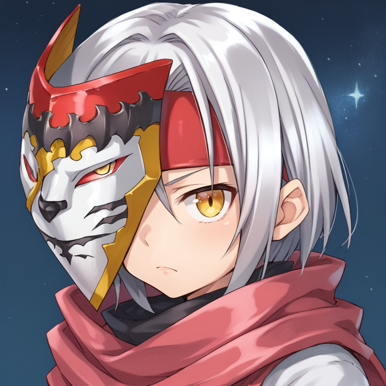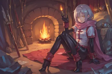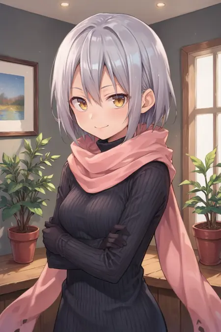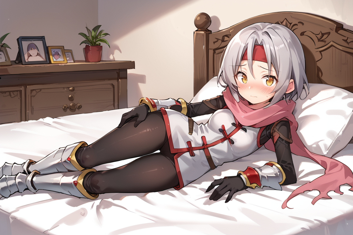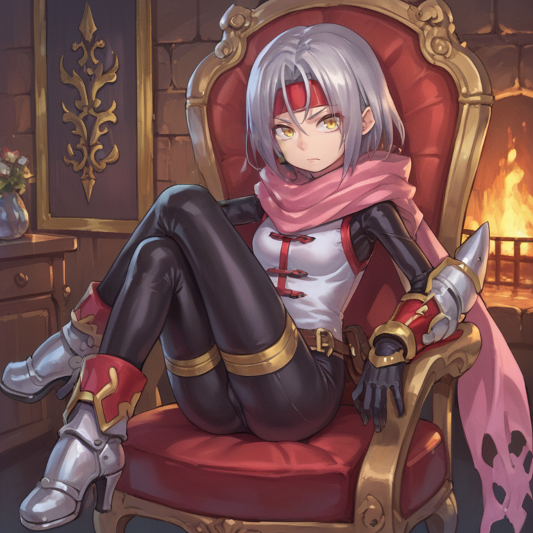 Helpful Tags: 1girl, short hair, grey hair, yellow eyes, red headband, scarf, pink scarf, white sweater vest, white shirt, bodysuit, black bodysuit, bodysuit under clothes, (single gauntlet), black gloves, sheathed, armored shoes,