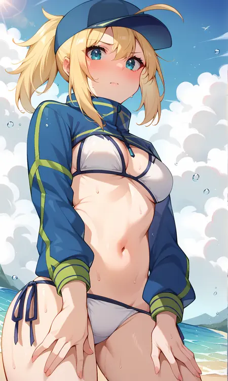泳装版本:蓝色夹克,长袖,腕带,开衫(衣物),白色比基尼,侧系带比基尼下装,单腿腰带