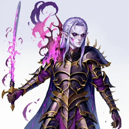Tz'arkan, pointy ears, purple eyes, black sclera, white skin, armor, purple fire,