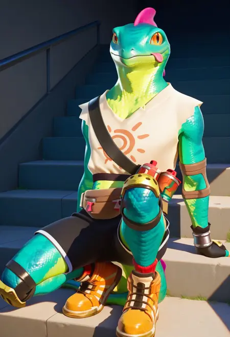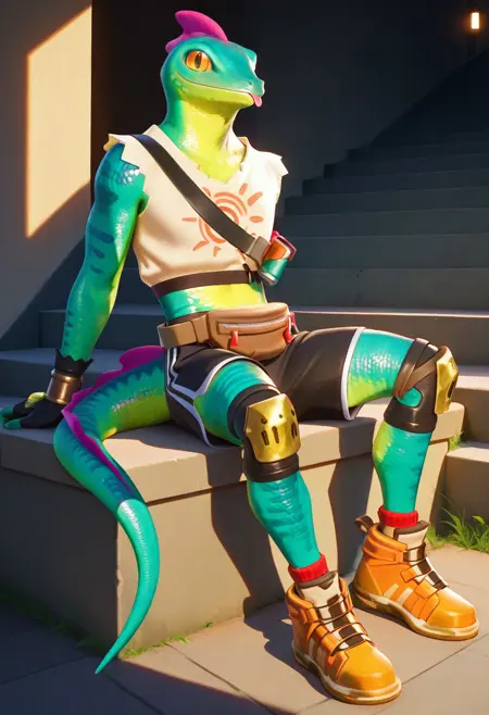 lizzik、人間化されたトカゲ男、緑色の肌、うろこ模様の肌、トカゲの頭、舌を出している、オレンジ色の目、黄色い sclera、ピンクのフィンモヒawk、長い尾、ピンクの尾ヒレ、薄いクリーム色のキャミソール、赤い太陽のシンボル、茶色の腕バンド、金属製のブレスレット、指なしの黒い手袋、胸に掛かったストラップに二つの手榴弾、オレンジ色のパンツの上に白いストライプの入った黒いショーツ、茶色のユーティリティベルト、黒い膝ガード、装甲付き膝保護、赤い靴下、オレンジ色のハイカットスニーカー、装甲付きシューズ保護、