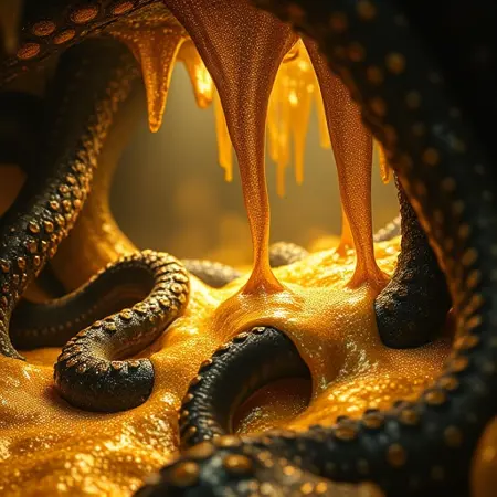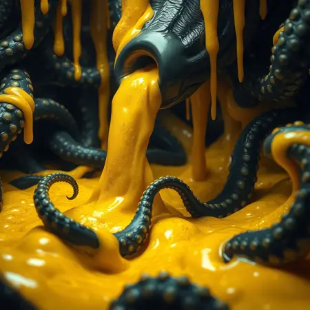 このFLUX LoRAは、あなたの画像に金色に輝く粘液を持つ黒い触手を追加します。