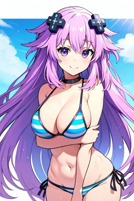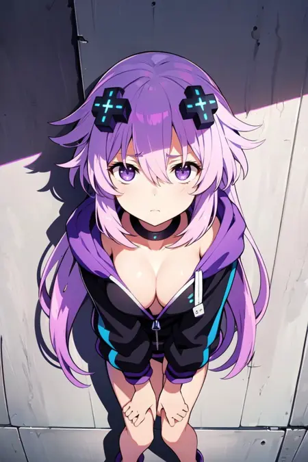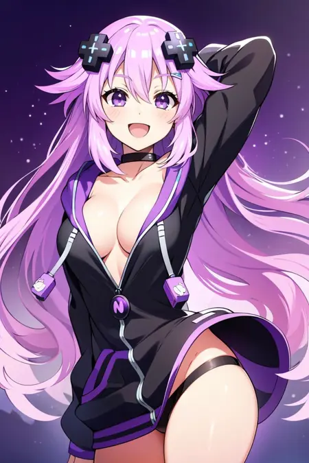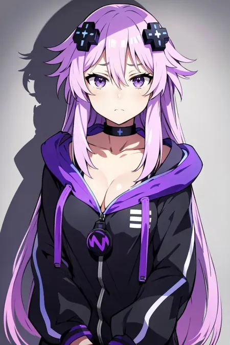 要召唤她,请使用以下标签:pikkyadultneptune, 1girl, long hair, solo, purple hair, purple eyes, looking at viewer, breasts, smile, d-pad hair ornament, blush, jacket, cleavage, hood, choker