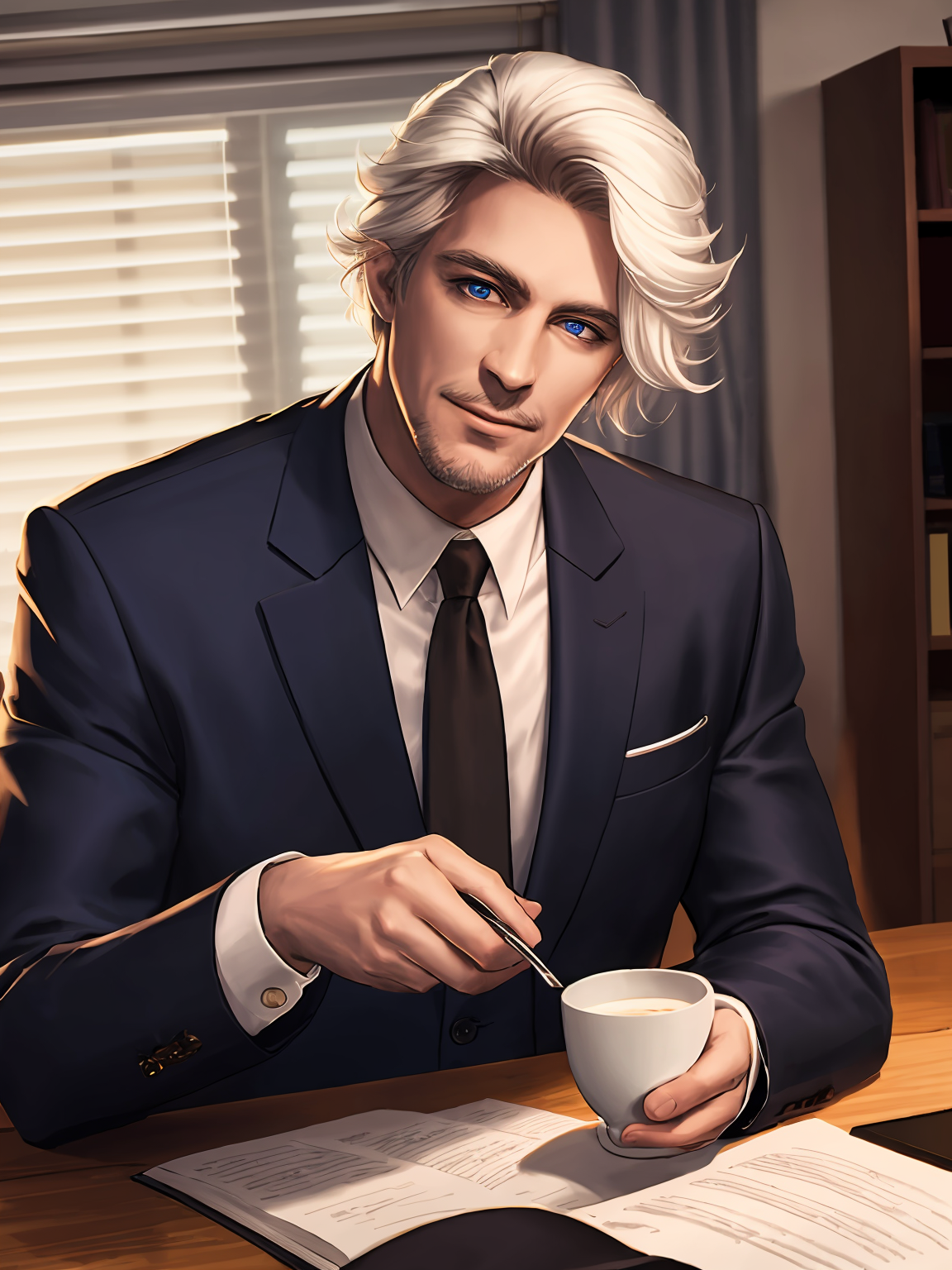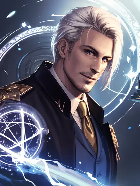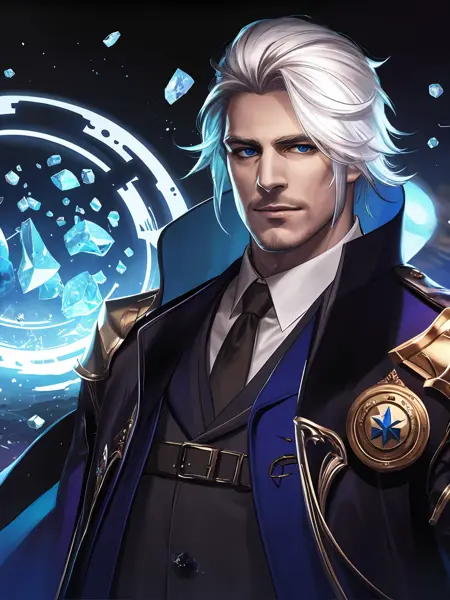 1man(boy),(old),(beard),black suit,tie,blue eyes,(cape),(armor),(medal)