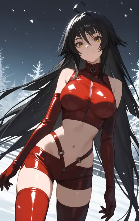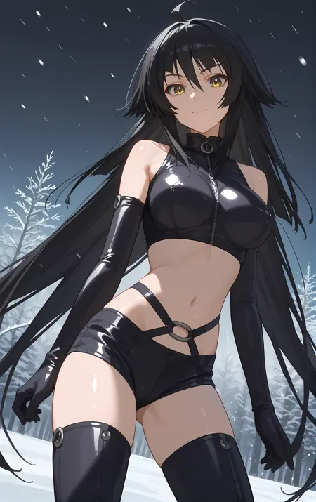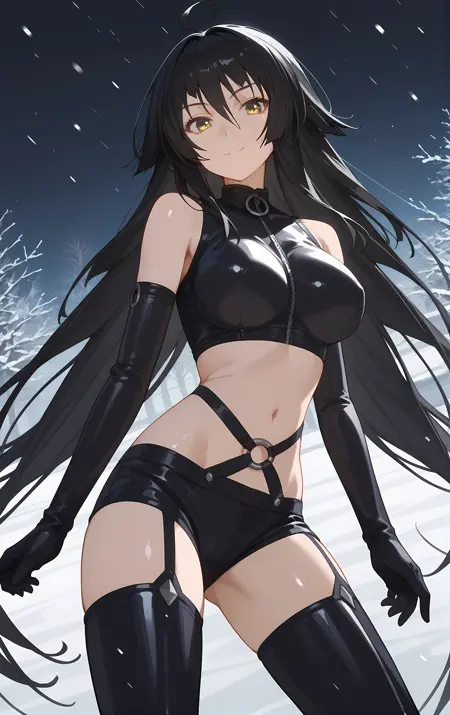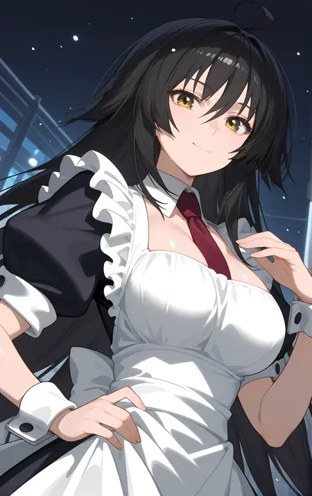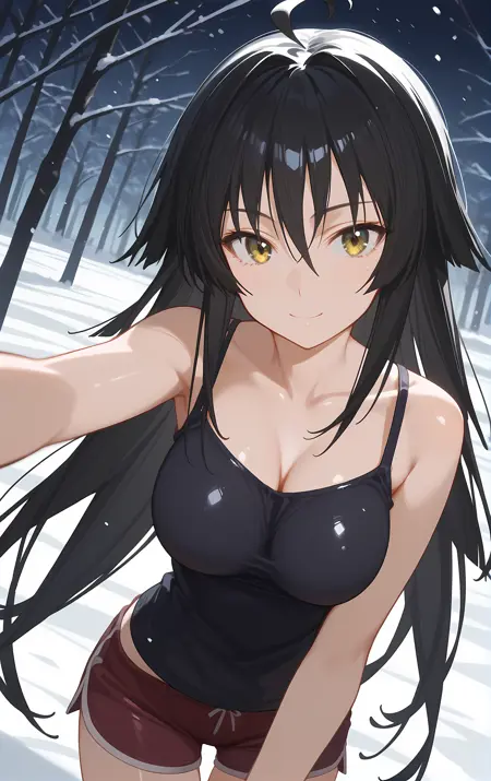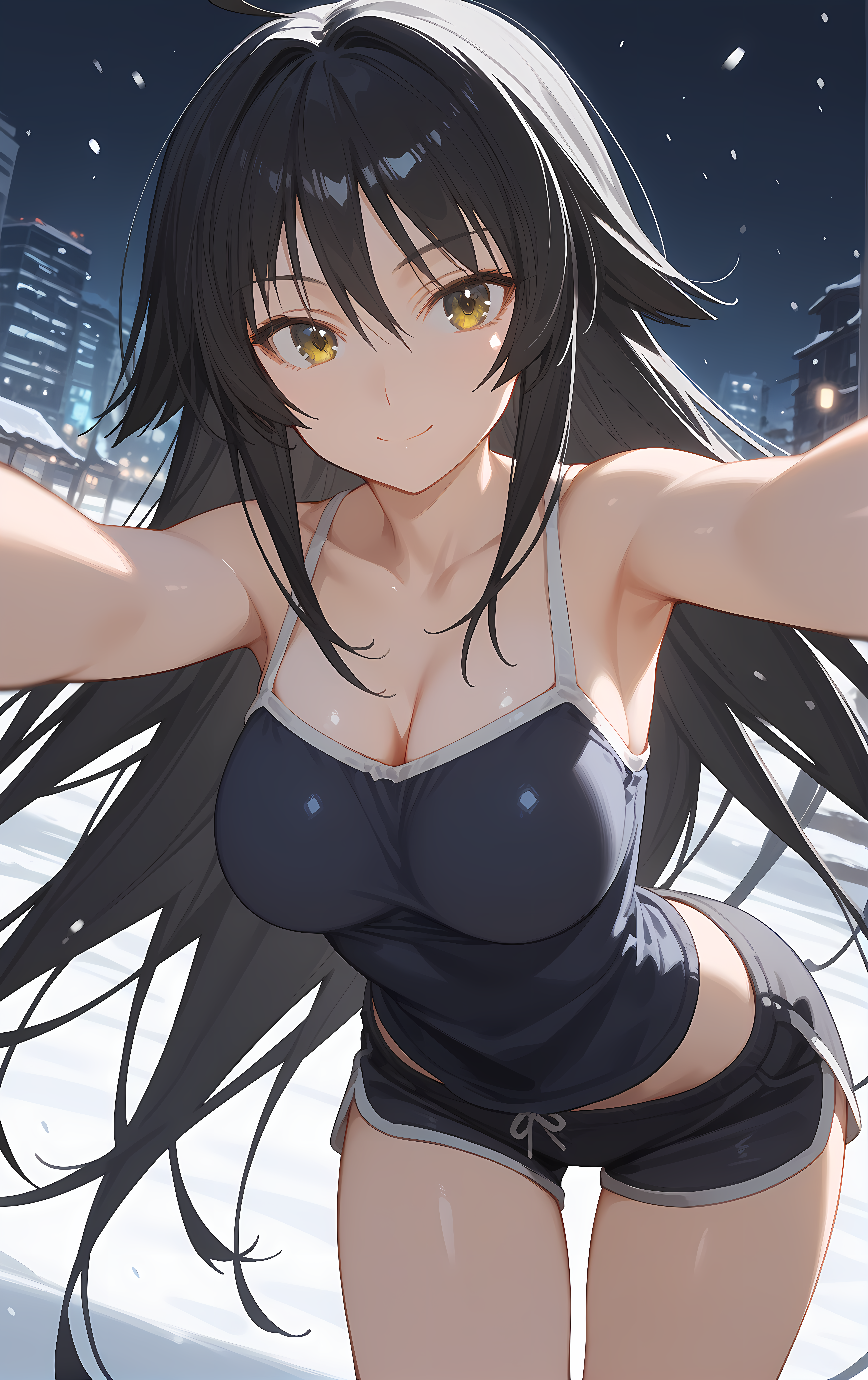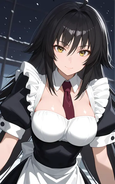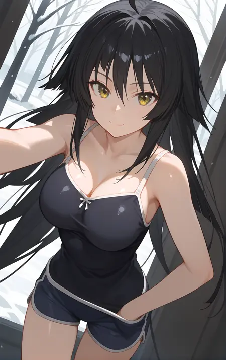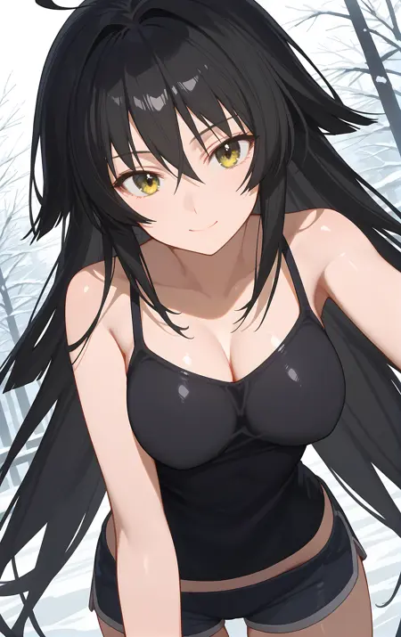 외모 → ohwx, 1girl, solo, yellow_eyes, black_hair, long_hair, very_long_hair, long_hair, ahoge, breasts, large_breasts,