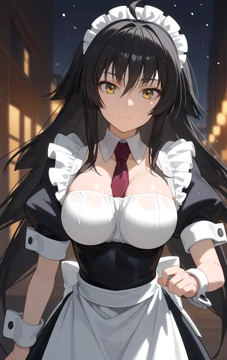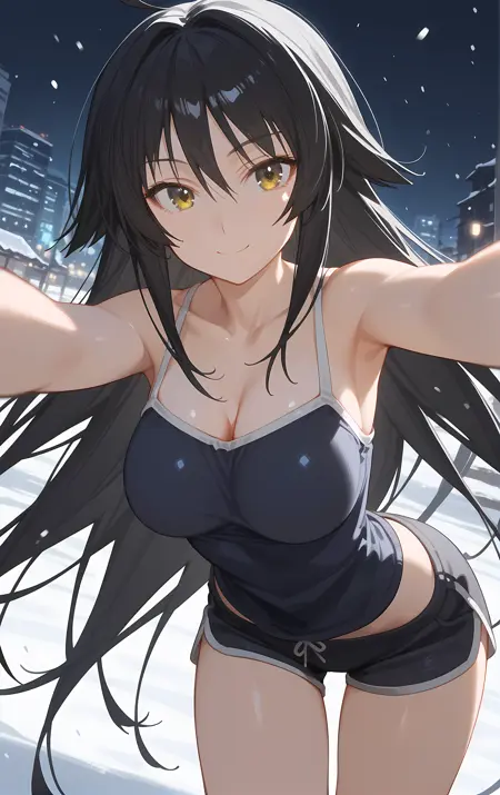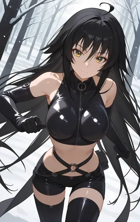 Appearance → ohwx, 1girl, solo, yellow_eyes, black_hair, long_hair, very_long_hair, long_hair, ahoge, breasts, large_breasts,