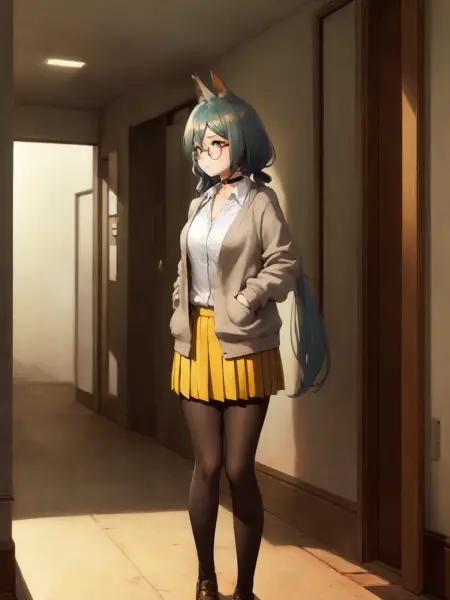 기본, 낮은 이중꼬리, 단풍잎, 머리 위의 잎, 머리 장식, 안경, 동글한 안경, 검은 목걸이, 일본 의복, 검은 한복, 긴 소매, 손가락을 넘는 소매, 넓은 소매, 노란 스커트, 주름 스커트, 하카마 스커트, 검은 양말, 오비, 타비, 샌달