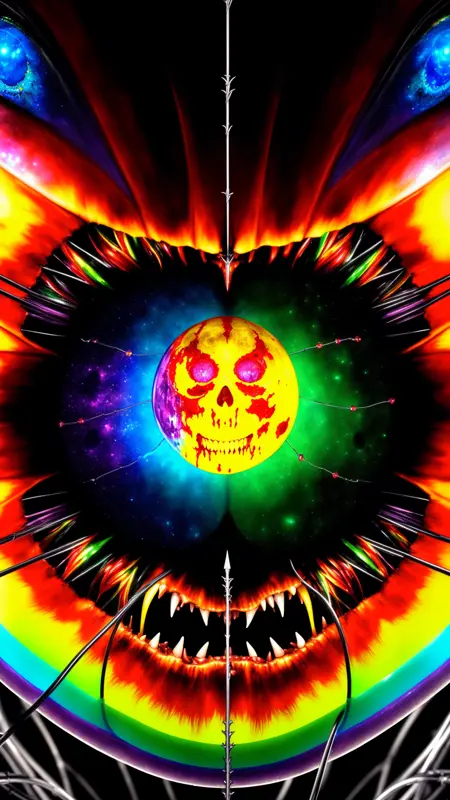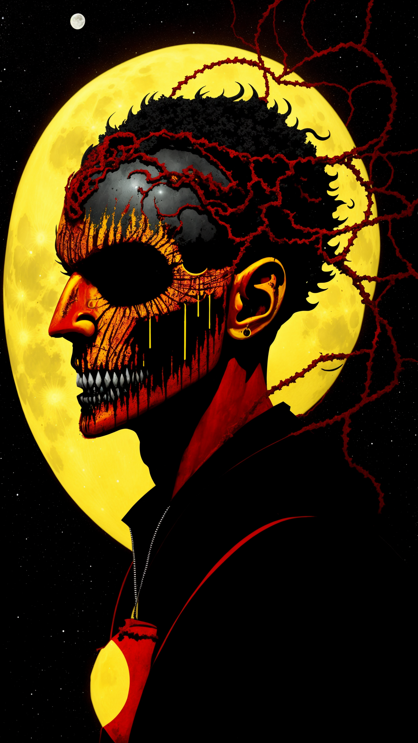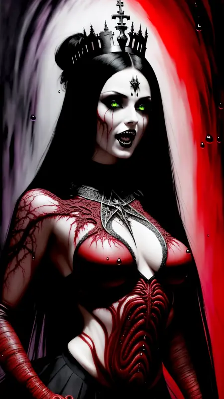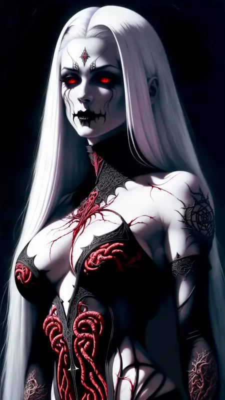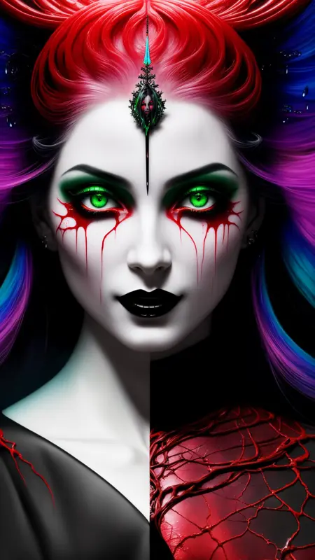 推奨プロンプト: クトゥルフ崇拝教団、不気味な雰囲気の緑の少女、机の上に血が滴り落ち、悪魔の頭がついた人物、ギーガー風のスタイル、周囲に大量の血、ハイパーリアリズム、超現実的なカラー写真、現実的な写真、暗い雰囲気、リアルな血、HDR、極めて詳細、シャープな肌、高品質レンダリング、超現実的な影、極めて明確なポイント
