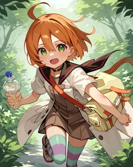 医生,1个女孩,独奏,短发,绿眼,呆毛,橙色头发,刘海,眼睛之间的头发,包,短袖,条纹长筒袜,多色腿部服饰