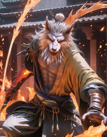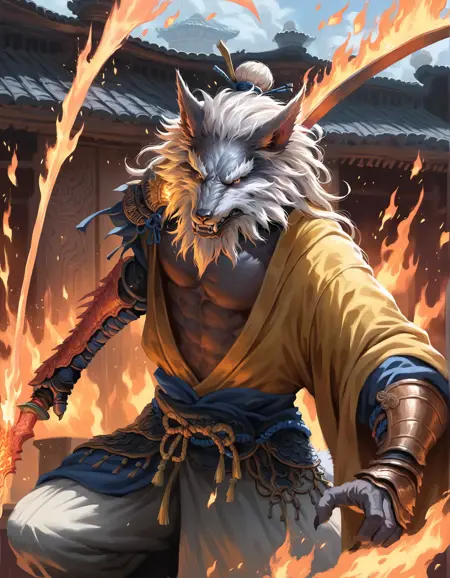 gz, wolf yaoguai, mature, white mane hair, white beard, hair bun. Outfits:chinese clothing, battle robe, gauntlets, hair tie. Weapon:flame blade.Old Lingxuzi: