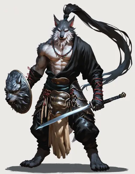 lxw, wolf yaoguai, beard, long ponytail. Outfits:black topwear, chinese clothing, leather armor, unconvincing armor, arm wraps, necklace, loincloth, chewing stick, pecs, half clothed. Weapon:swordorblade,shield.Wolf Stalwart: