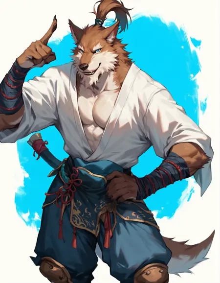 ljk, wolf yaoguai, beard, long ponytail. Outfits:hair tie, chinese clothing, white topwear, arm wraps, blue pants, knee pads.Wolf Soldier: