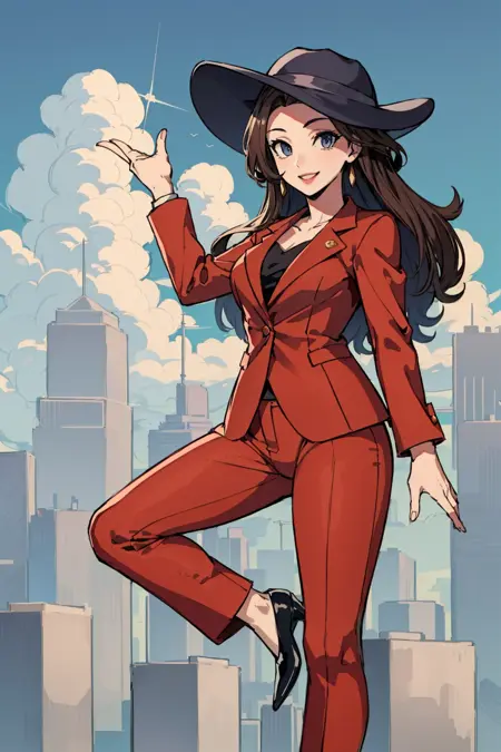 • 빨간 수트 버전에 "보라색 모자, 빨간 자켓, 빨간 바지, 하이힐"을 추가.