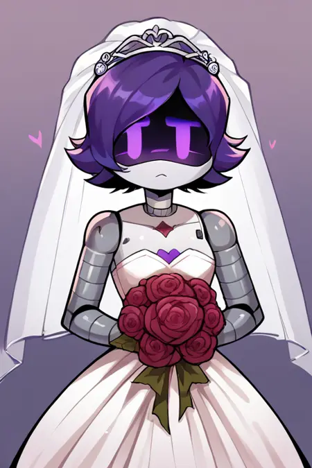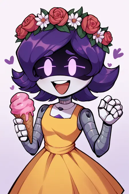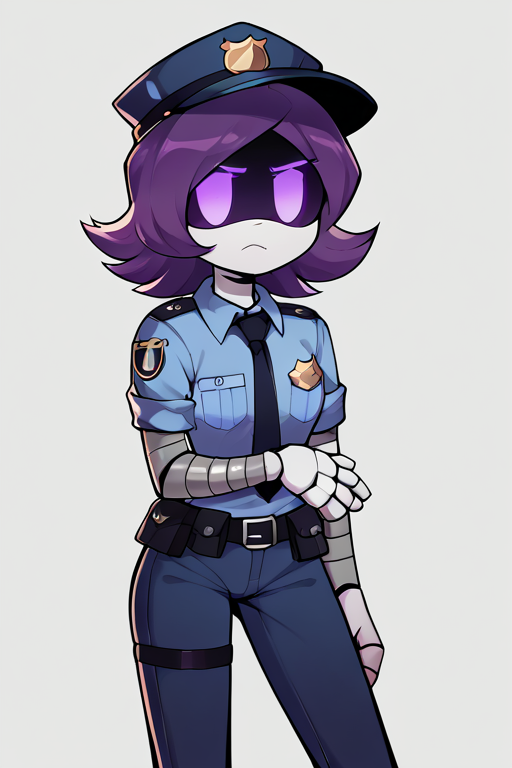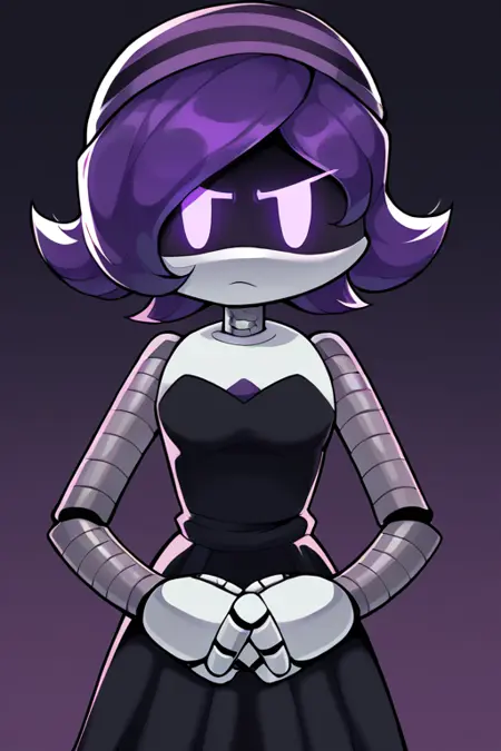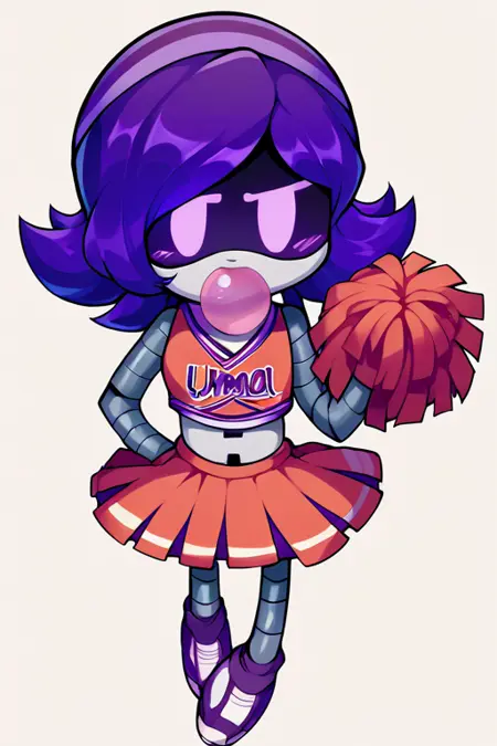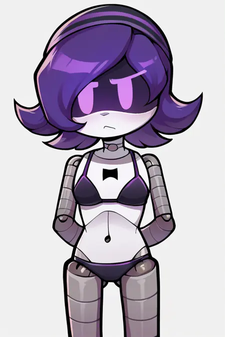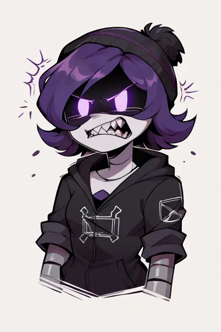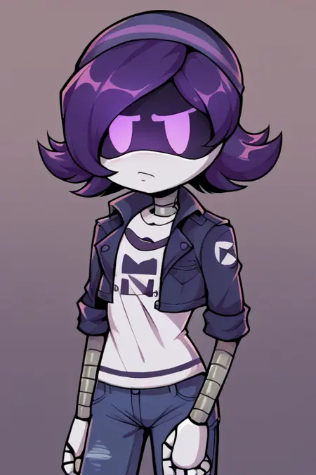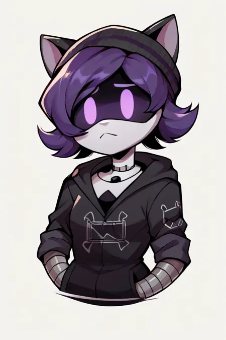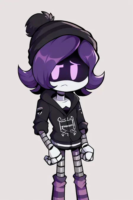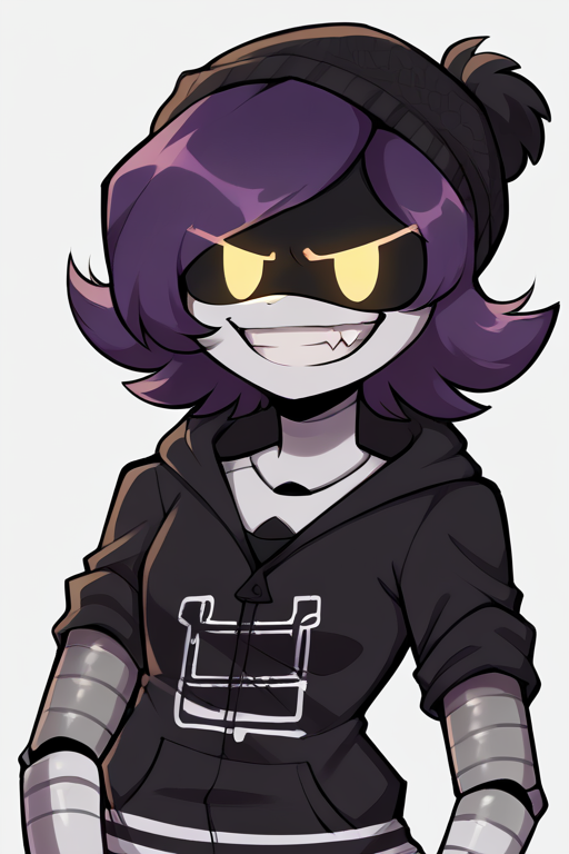 Prompts: Uzi, Purple Hair, Purple Eyes, Robot, Visor, Black Hoodie, Beanie, Striped Socks, Boots