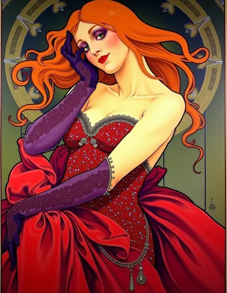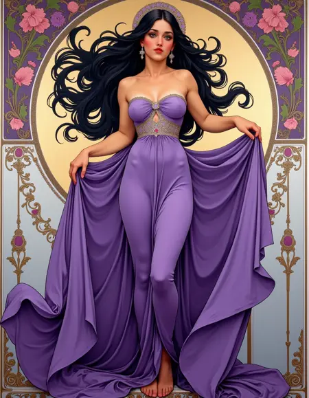 a painting by Alphonse Mucha depicting ...some style elements but not full-blown Mucha style: