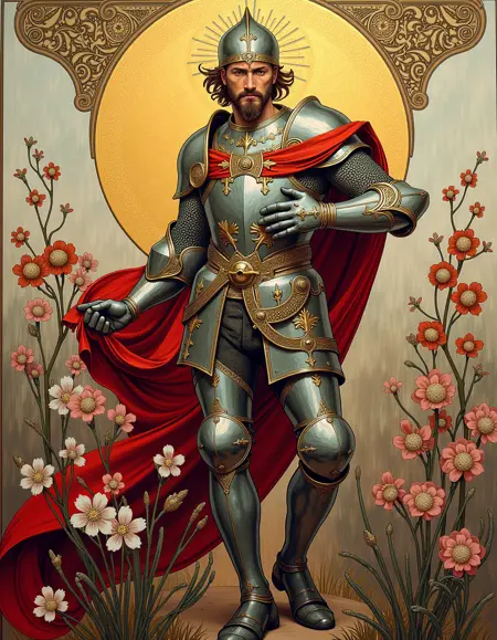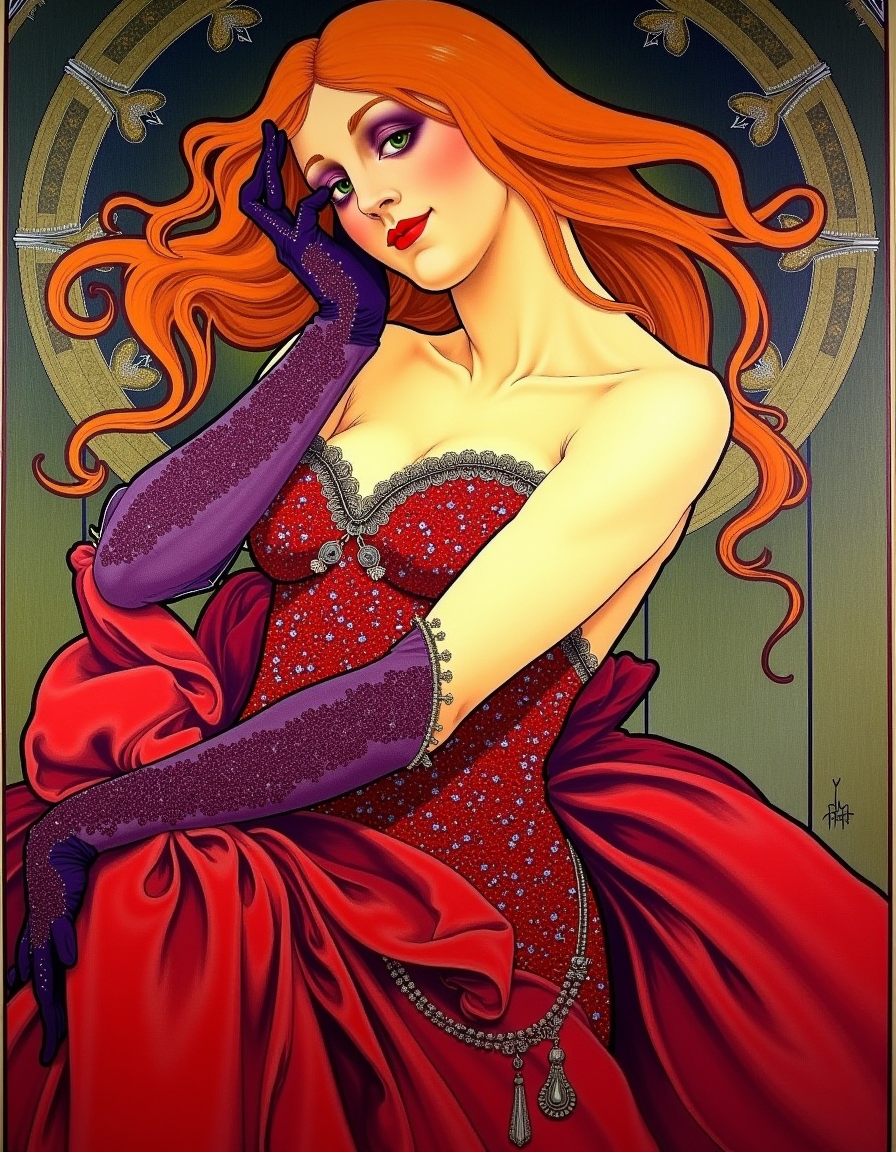 a painting by Alphonse Mucha depicting ...일부 스타일 요소는 있지만 완전한 무하 스타일은 아님: