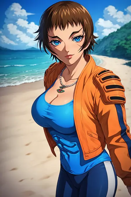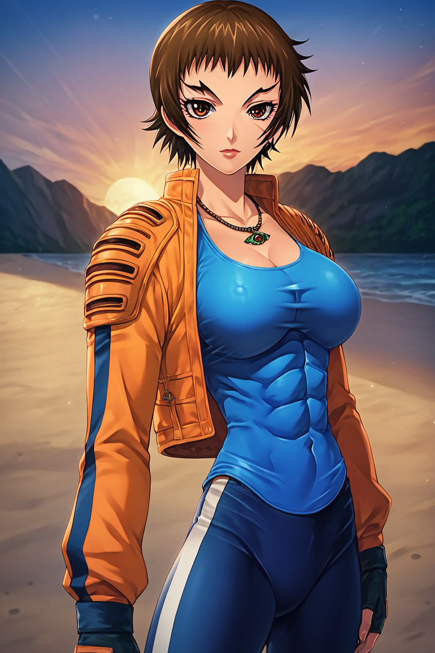 prompt : Kaname kugatachi, brown hair, blue eyes, scar, necklace, breast, abs, orange leather jacket, blue sleeveless shirt, tight shirt, blue leggings