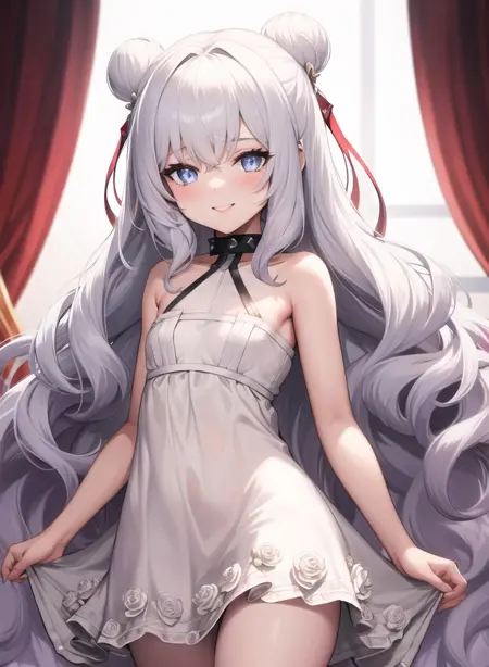 double bun, long hair, short dress, sleeveless, sleeveless dress, sundress, white dress, white_flower, white_rose, halter dress, black camisole, black collar, spiked collar,le_malin_(the_knight's_true_nature)_(azur_lane)