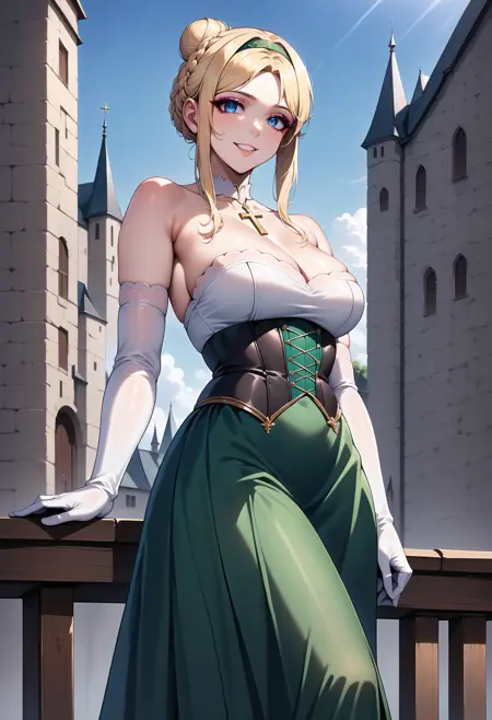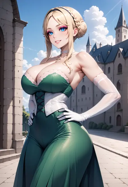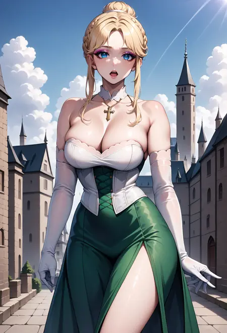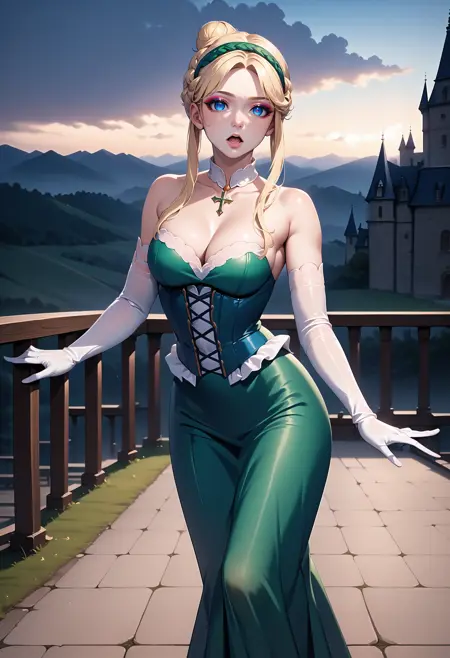 Prompts:1girl, AnnetteRenard, solo, blue eyes, eyeshadow liner, short hair, long locks, blonde hair, braided ballet bun, french braid, hair band, green dress, long dress, white gloves, elbow gloves, lace up gloves, side slit, corset, breast suppress, cleavage, bare shoulders, (white choker), cross necklace,