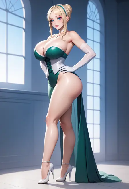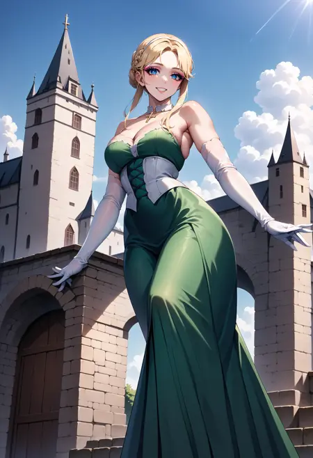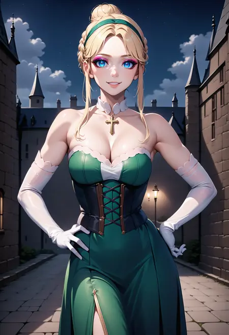 プロンプト: 1girl, AnnetteRenard, solo, 青い目, アイシャドウライナー, 短い髪, 長い髪, 金髪, 編み込みのバレエの結い, フレンチブレード, ヘアバンド, 緑のドレス, 長いドレス, 白い手袋, 肘まである手袋, 紐で結ぶ手袋, サイドスリット, コルセット, 乳房圧迫, 胸元, 肩出し, (白い首輪), 十字架のネックレス