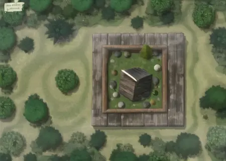 一张被绿色树木包围的小木结构地图(2个)