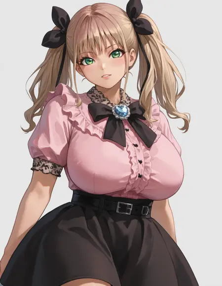 "yumloitaa, green eyes, twintails, black skirt, jirai kei, pink shirt, puffy short sleeves, black bow, hair ribbon, long hair, frills, brooch, belt, puffy sleeves, blouse, hair bow, jewelry, frilled shirt, shirt bow"