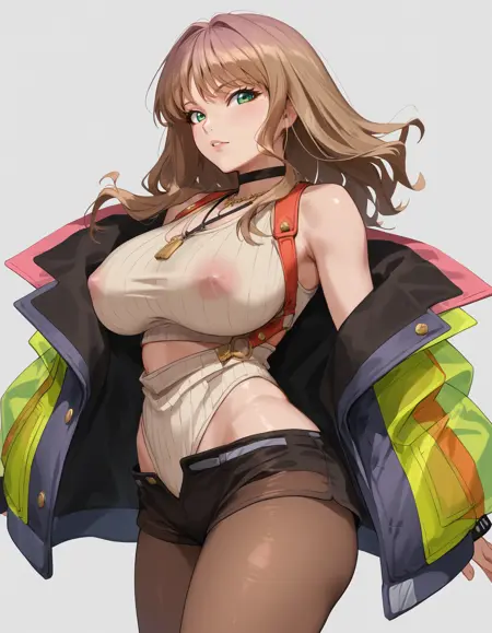 "yumdrem, green eyes, black shorts, brown pantyhose, brown leotard, black choker, long hair, jewelry, jacket, brown hair, necklace, see-through, short shorts, bare shoulders, leotard under clothes, ribbed leotard, layered clothes, multicolored jacket, medium hair, clothing cutout, harness, brown crop top, ribbed crop top, black jacket, highleg leotard"