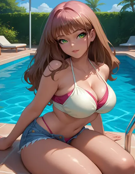 "yumpik, 초록색 눈, 분홍색 비키니, 콘 모양 머리 결, 다리에 흉터, 갈색 머리, 분홍색 팔찌, 앞쪽 매듭 비키니 탑, 프릴이 있는 비키니, 비키니 치마"