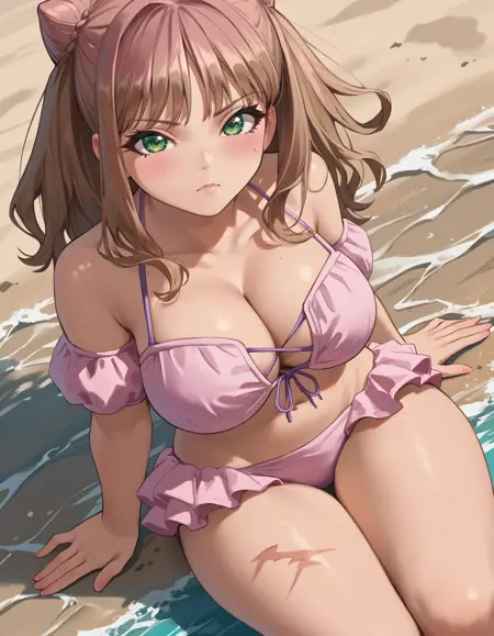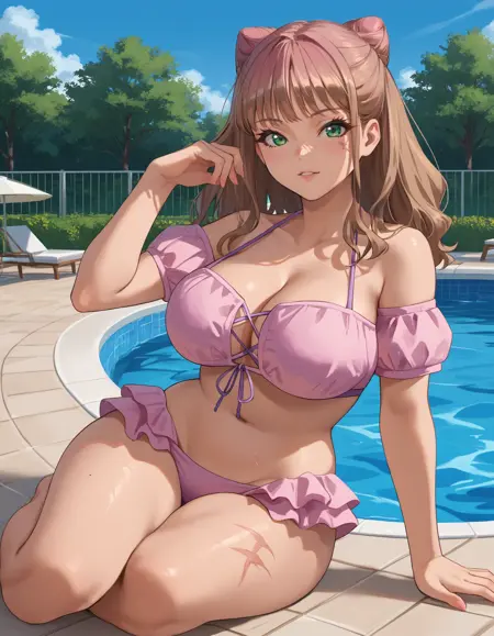 "yumpik, green eyes, pink bikini, cone hair bun, scar on leg, brown hair, pink armband, front-tie bikini top, frilled bikini, bikini skirt"