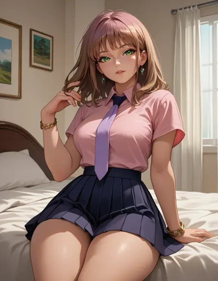 "yumschmo, purple necktie, brown hair, green eyes, jewelry, bracelet, pink short sleeved shirt, medium hair, black pleated skirt"