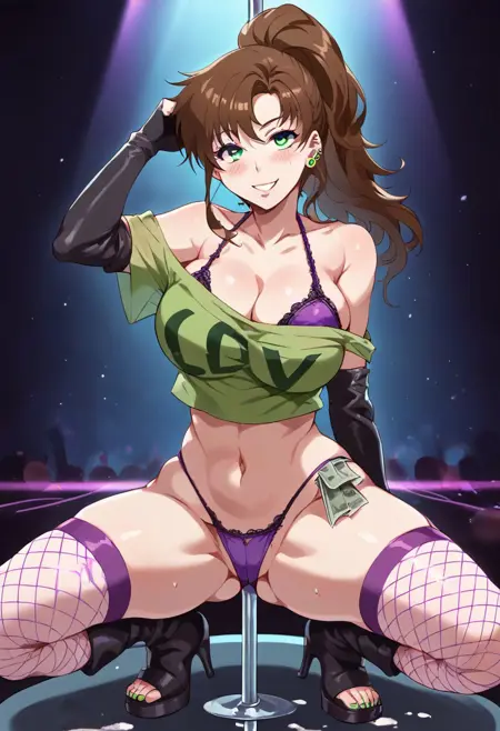 2. ((green sailor bitch uniform, pink bowtie with green gem, sheer white slinghot leotard, white gloves with green edge, green choker necklace, sailor jupiter golden tiara headband with green crystal, )) , green high-heels, pink flower-shape earrings, hair tie with green balls,