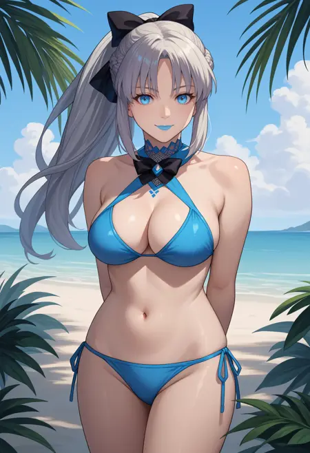 Water Princess: m0rganswim, grey hair, ponytail, french braid, twin braids, hair ribbon, hair flower, gold trim, white bikini, puffy long sleeves, detached sleeves, bare shoulders, large breasts