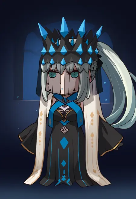 Queen of Winter: m0rganqueen, blue lips, grey hair, ponytail, french braid, hair bow, black bow, crown, black veil, two-tone dress, black dress, long sleeves, wide sleeves, black gloves, pelvic curtain, cleavage, large breasts
