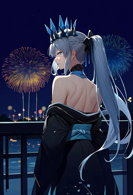 FGO Festival 2023: m0rganfes2023, grey hair, ponytail, french braid, twin braids, hair bow, hair flower, blue flower, yukata, white kimono, floral print, long sleeves, wide sleeves, sash, obi