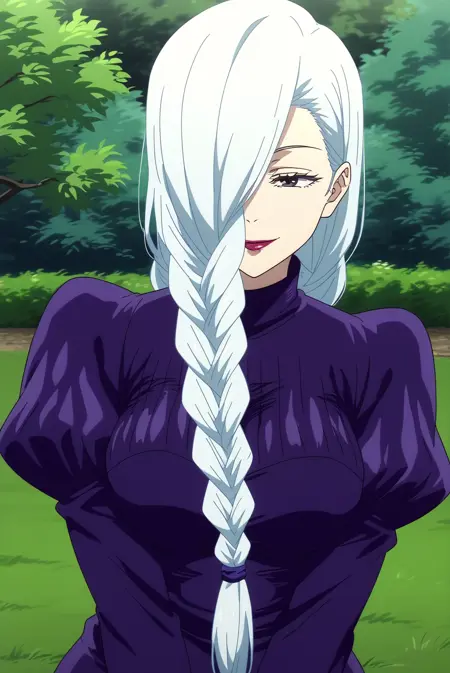 触发词:妹妹,长发,辫子,口红,裙子,头发遮住一只眼睛,长袖。