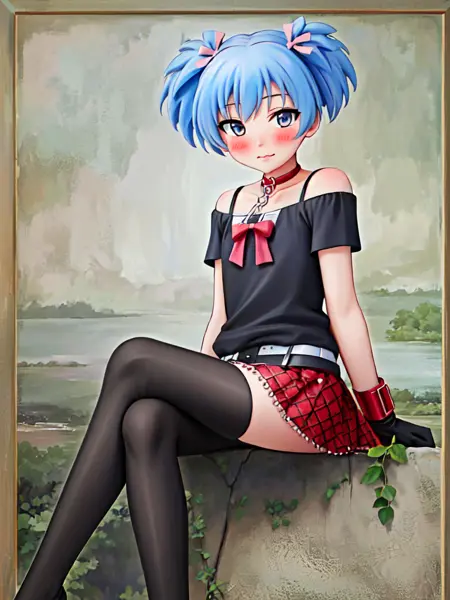 hair bow, bracelets, red skirt, black shirt, black socks, choaker, pink bow