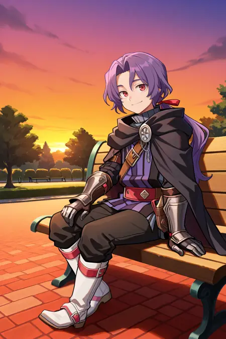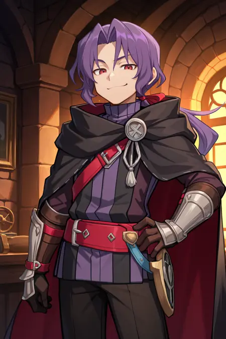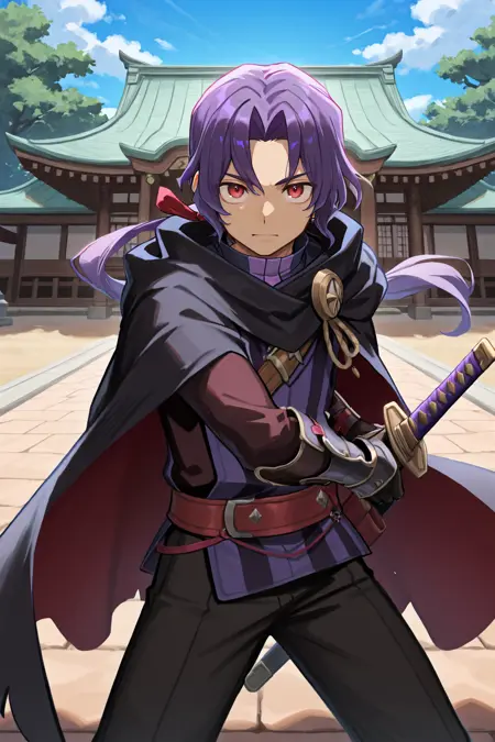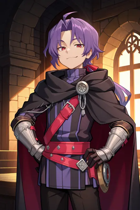 유용한 태그: 1boy, 빨간 눈, 보라색 머리, 긴 머리, 폰티테일, 낮은 폰티테일, 머리 리본, 검은 망토, 케이프, 줄무늬 투닉, 투닉, 벨트, 검은 바지, 장갑, 갑옷, 흰 부츠
