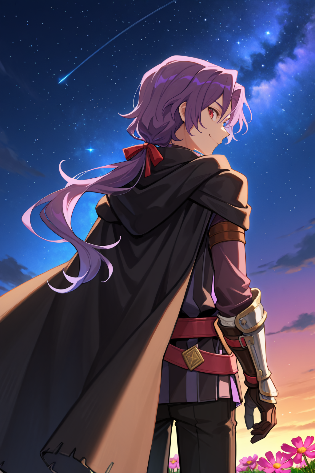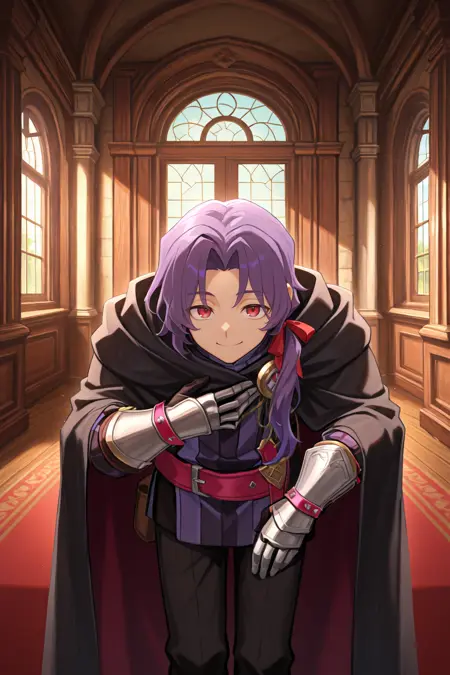 유용한 태그: 1boy, 빨간 눈, 보라색 머리, 긴 머리, 폰티테일, 낮은 폰티테일, 머리 리본, 검은 망토, 케이프, 투닉, 벨트, 검은 바지, 장갑, 갑옷, 흰 부츠