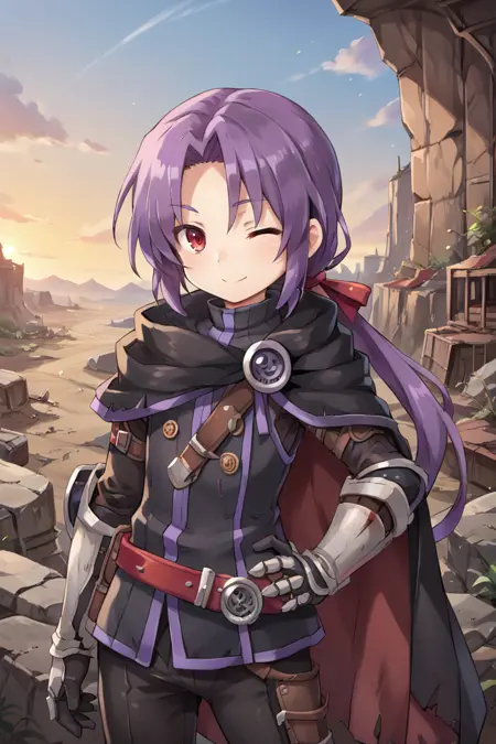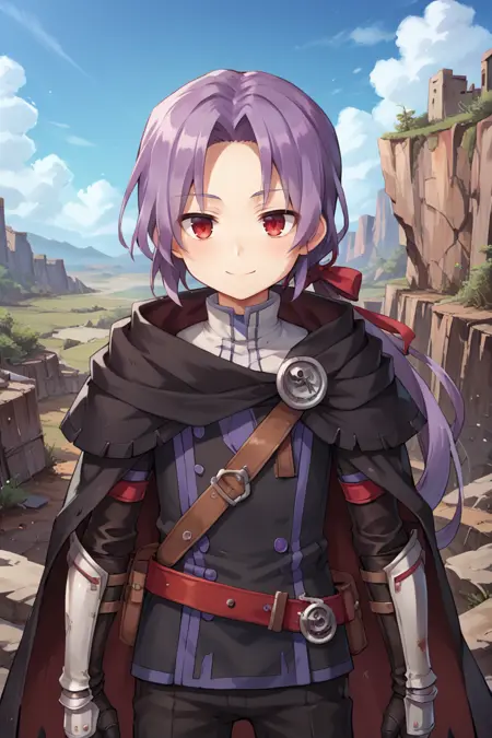 유용한 태그: 1boy, 빨간 눈, 보라색 머리, 긴 머리, 폰티테일, 낮은 폰티테일, 머리 리본, 검은 망토, 케이프, 투닉, 벨트, 검은 바지, 장갑, 갑옷, 흰 부츠