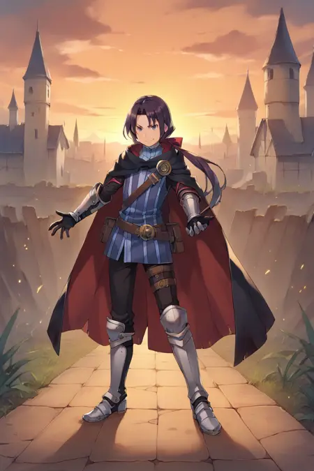 유용한 태그: 1boy, 빨간 눈, 보라색 머리, 긴 머리, 폰티테일, 낮은 폰티테일, 머리 리본, 검은 망토, 케이프, 줄무늬 투닉, 투닉, 벨트, 검은 바지, 장갑, 갑옷, 흰 부츠