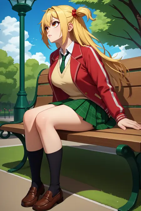 그녀의 전형적인 룩을 위해서는 "노란 스웨터 조끼, 녹색 넥타이, 빨간 재킷, 녹색 스커트, 주름 스커트"를 추가하세요.